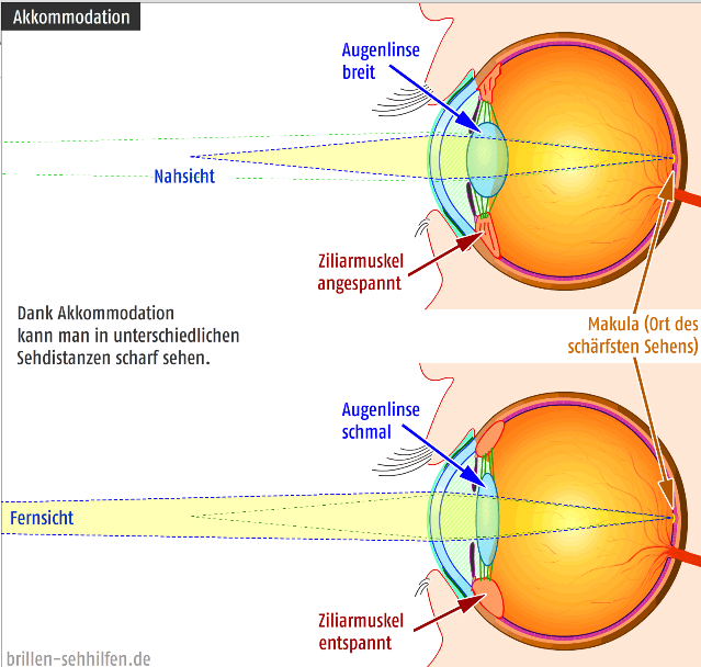Einstellung des Auges auf das Nahsehen (Nahakkommodation) bzw. das Sehen in der Ferne (Fernakkommodation) durch Änderung der Form der Linse und damit ihrer Brechkraft. |