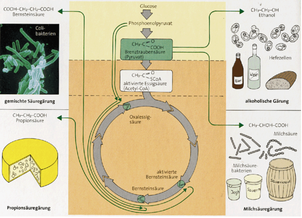 Fermentation der anaerobe Abbau einer Substanz wie Glucose in kleinere Moleküle wie Milchsäure oder Alkohol im Energiestoffwechsel. |