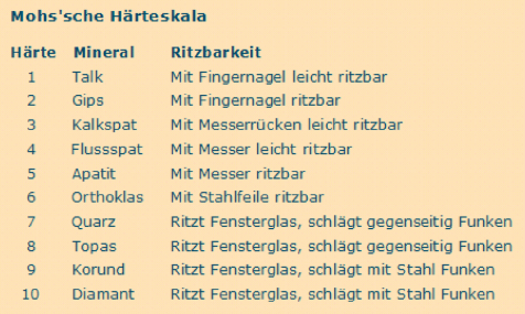Die Ritzhärte wurde von einem Mineralogen Namens Friedrich Mohs vor etwa 200 Jahren erarbeitet und eingeführt. Das ist auch der Grund, warum diese Härte ebenfalls als Mohshärte bekannt ist. Sie zählt zu den ältesten Härteprüfverfahren und wird auch heute noch eingesetzt. Dabei geht es um den mechanischen Widerstand eines Minerals gegen das Eindringen beim Ritzen mit einem scharfkantigen Gegenstand. Im Grunde werden also verschiedene Materialien miteinander verglichen und eine Art „Rangliste“ erstellt. Zur einfachen Einteilung besteht diese Liste nur aus 10 „Rängen“ und wird Mohs Härteskala genannt. Als weichstes Prüfmineral gilt Talk mit dem Wert 1. Das Härteste ist Diamant mit dem Wert 10. Zwischen diesen beiden Stoffen sind alle anderen Materialien angeordnet. |