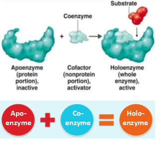 Viele Enzyme benötigen ein Coenzym, um katalytisch wirksam zu sein. Die Gesamtheit aus Enzym-Protein und jeweiligem Coenzym wird als Holoenzym bezeichnet (von griechisch holos "ganz, vollständig"), denn erst nachdem das Coenzym hinzugetreten ist, kann die Katalyse stattfinden. Zur begrifflichen Abgrenzung wird die Enzymform, die noch nicht das Coenzym gebunden hat und daher noch keine Katalyse betreiben kann, als Apoenzym bezeichnet. |