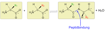 Bindung zwischen Aminosäureresten in einem Protein; erfolgt zwischen der Carboxylgruppe der einen Aminosäure und der Aminogruppe der anderen Aminosäure (–CO–NH-) unter Abspaltung von Wassermolekülen |