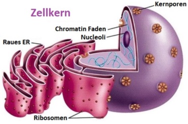 Der Zellkern (Größe 3-15 Mikron) ist abgesehen von der Zentralvakuole in manchen Pflanzenzellen das größte Zellorganell einer eukaryotischen Zelle. |