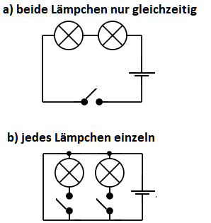 Zeichne zwei Schaltpläne für zwei Lämpchen, zwei Schalter und eine Quelle zu einem Stromkreis so dass: