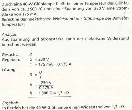Durch ein 40W Glühlampe fließt bei einer Temperatur des Glühfadens von ca. 2500°C und einer Spannung von 230V eine Stromstärke von 175 mA. Berechne den elektrischen Widerstand der Glühlampe bei Betriebstemperatur!