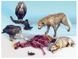 Großkatzen, Wildhunde, Hyänen, Schakale, Ratten, Rabenvögel, Geier, Aasfliegen, Aaskäfer, Möwen, Haie, Weißfische, Krebse, etc. |