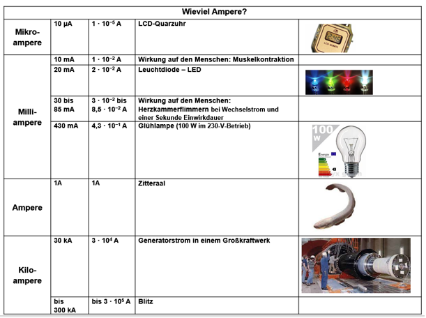 1 A = 1.000 mA (Milliampere) 1 A = 6,24 ⋅ 1018 Elektronen pro Sekunde | ||||