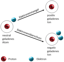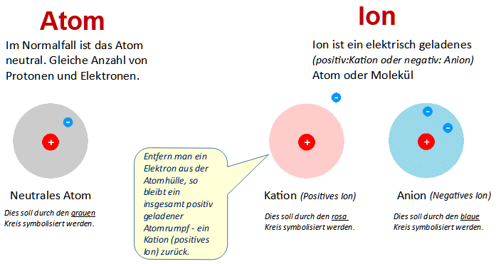 Atom → Elektronenmangel → Positiv geladenes Ion = Kation Atom → ElektronenĂĽberschuss → Negativ geladenes Ion = Anion