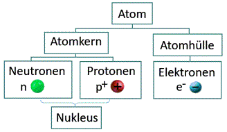 Atome bestehen aus der Atomhülle und dem Atomkern. Atomhülle: mit elektrisch negativ geladen Elektronen. Atomkern: enthält neben den Neutronen u.a. positiv geladene Protonen, und ist damit positiv geladen.
