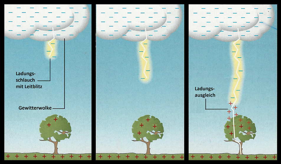 Wenn sich der untere Teil der Wolke negativ auflädt, lädt sich die darunterliegende Erde positiv auf. Zwischen Wolke und Erde baut sich eine elektrische Spannung von bis zu 10 Millionen Volt auf. Aus den unteren Bereich der Wolke schiebt sich zuerst elektrische Ladung wie ein Schlauch ruckweise in Richtung Erde vor. Nähert sich dieser negativ geladene Leitblitz der Erde, werden weitere Elektronen in der Oberfläche der Erde abgestoßen und zur Seite gedrängt. Die Erde ist am dieser Stelle noch stärker positiv geladen, Nun erfolgt der Ladungsausgleich. Ein von der Erde augehender Gegenblitz trifft mit dem Leitblitz zusammen und "frisst" sich in diesen hinein. Die Funkelbahn leuchtet hell auf und der eigentliche Hauptblitz entsteht. |