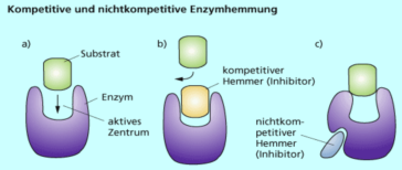 Bei der Kompetitiven Hemmung tritt der Inhibitor mit dem Substrat in einen "wettbewerb" um die Bindung am aktiven Zentrum. Seine Hemmwirkung nimmt daher mit zunehmender Substratkonzentration ab, während die Maximalgeschwindigkeit Vmax unverändert bleibt. |