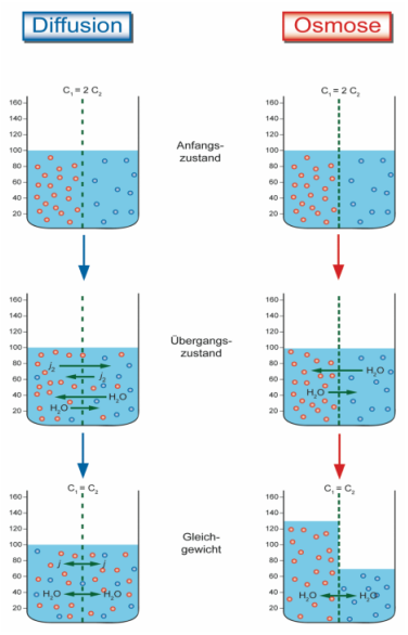 Diffusion von Molekülen eines Lösungsmittels durch eine selektiv permeable (semipermeable) Membran, die zwei Regionen unterschiedlicher Solutkonzentration voneinander trennt. |