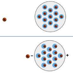 Auch nichtleitende Materialen (z.B. organischen Körpern) können durch einen geladenen Körper in ihrer Nachbarschaft beeinflusst werden. Ihrer Moleküle drehen sich so, dass die gegenseitige Ladung zueinander stehe. D.h. ihrer Dipolmolekülen richten sich einheitlich aus. |