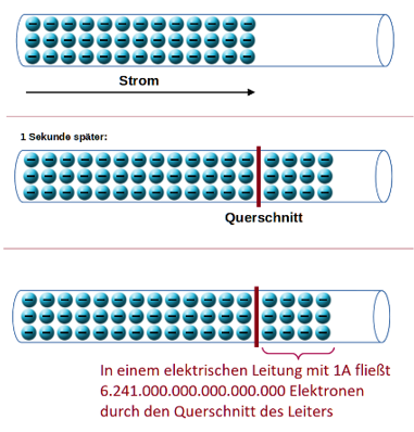 Die elektrische Stromstärke (I) gibt an, wie viel elektrische Ladungsträger (Elektrons) in einer Sekunde durch den Querschnitt des Leiters fließen. |
